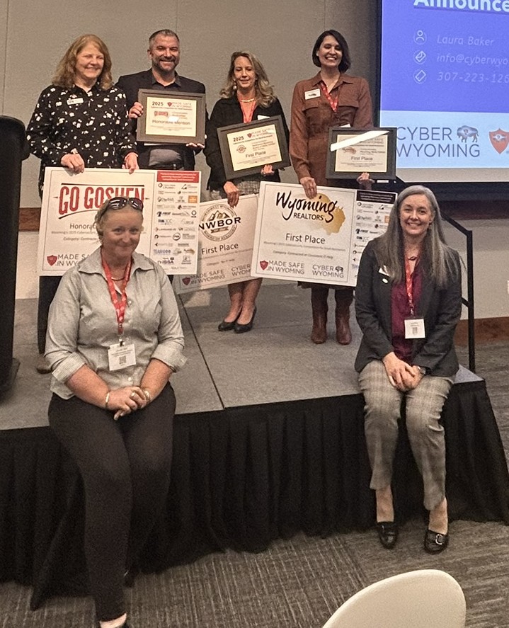 Back row left to right: CyberWyoming’s Cybersecurity Business Counselor Mary Keane representing Honorable Mention Moriah Harkins of Go Goshen, Palo Alto Networks’ Timothy Abbott, Northwest Board of REALTORS® Winner Kimberly Brandon-Wintermote, and Wyoming REALTORS® Winner Nicole Novotny-Smith.
